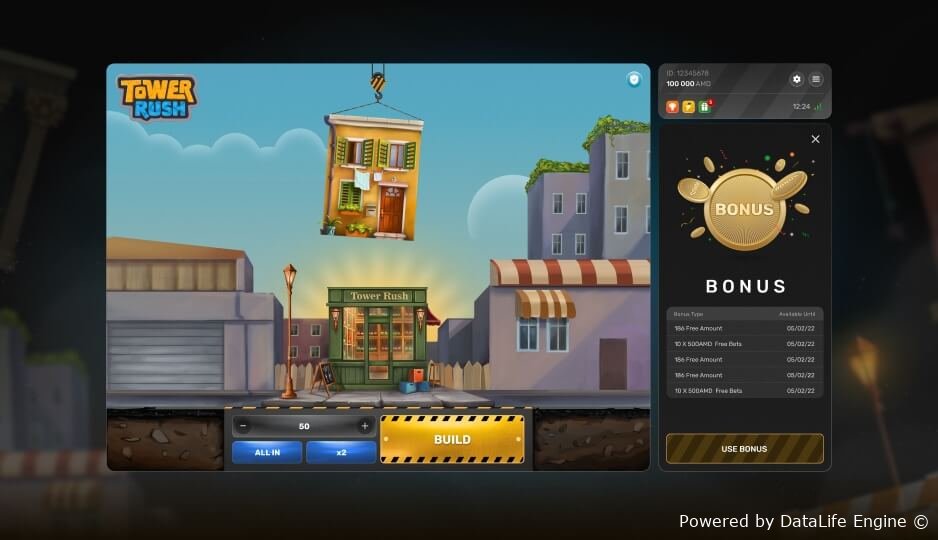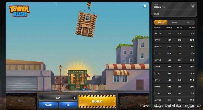 Tower Rush — это уникальный слот от разработчика Galaxsys, созданный в стиле Crash-игр. Суть проста: вы строите башню этаж за этажом, увеличивая множитель и свой потенциальный выигрыш. Чем выше вы подниметесь — тем больше денег сможете получить. Но главное — вовремя остановиться и забрать свой куш!